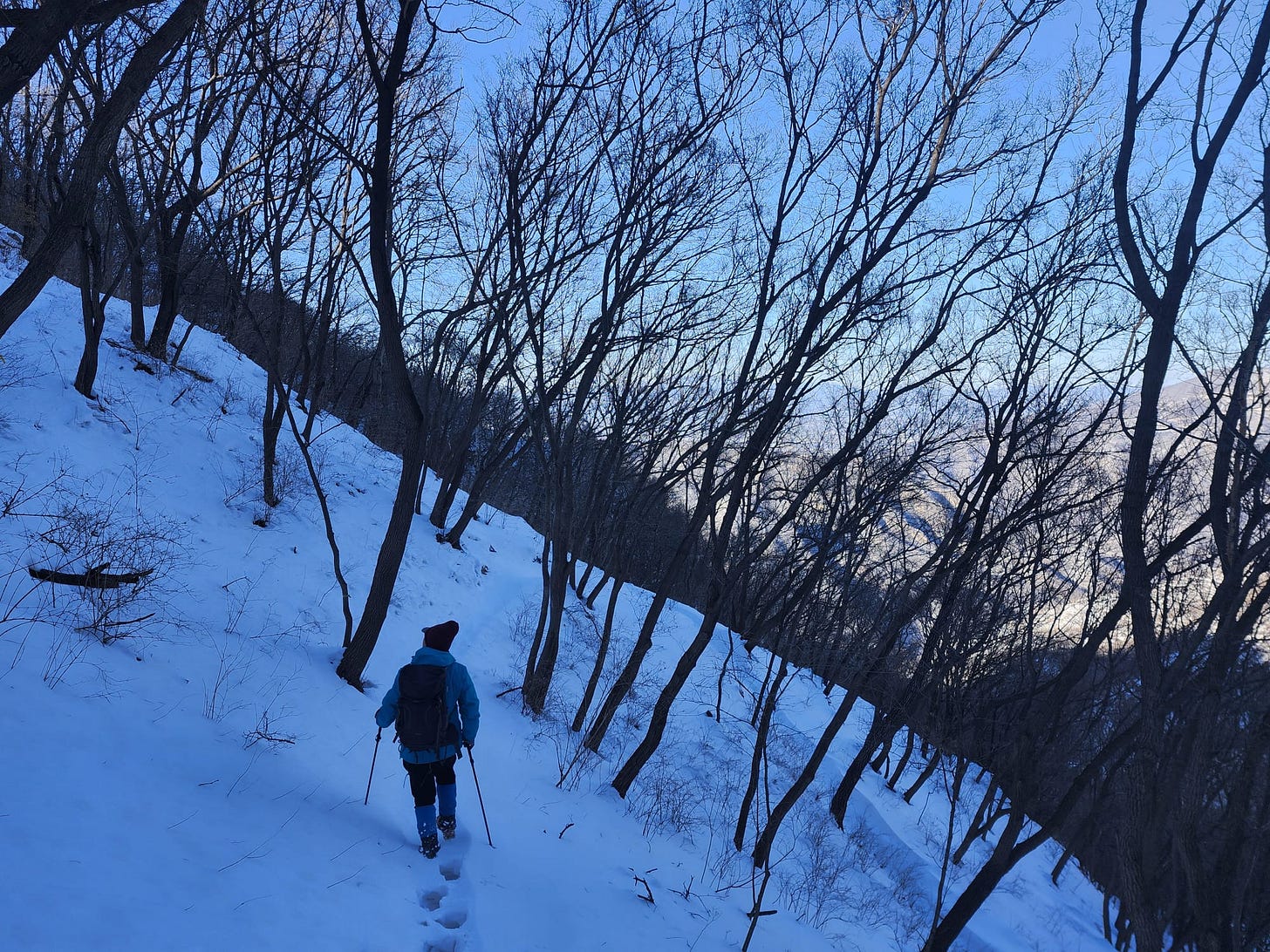 As the sun began to set, we eventually turned off the Wall and stepped through fresh unbroken snow amid bare trees along a buried trail, sloping down towards a village where our driver would pick us up. It reminded me of my childhood winters in the woods of New England. My Australian hiking buddies were unused to the snow, both enthused by the experience and surprised at the extensive potential for falling over.