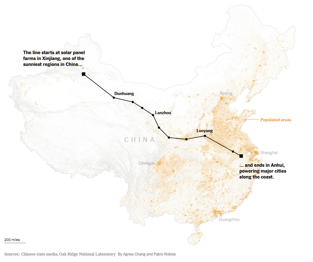 The New York Times recently reported that China’s longest-yet high voltage power line, one of dozens, brings clean electrons from a solar farm in Xinjiang to cities in Anhui — a transmission over a distance similar to that from Idaho to New York City! One big innovation has been the use of direct current, which has much lower losses over long transmission distances but will then need to be converted into alternating current to run most devices, from EVs to high-speed trains to smartphones.