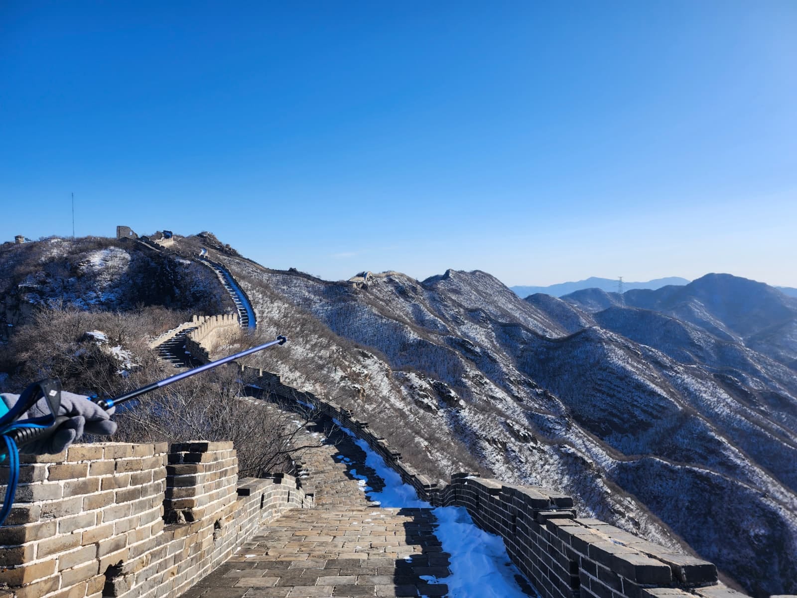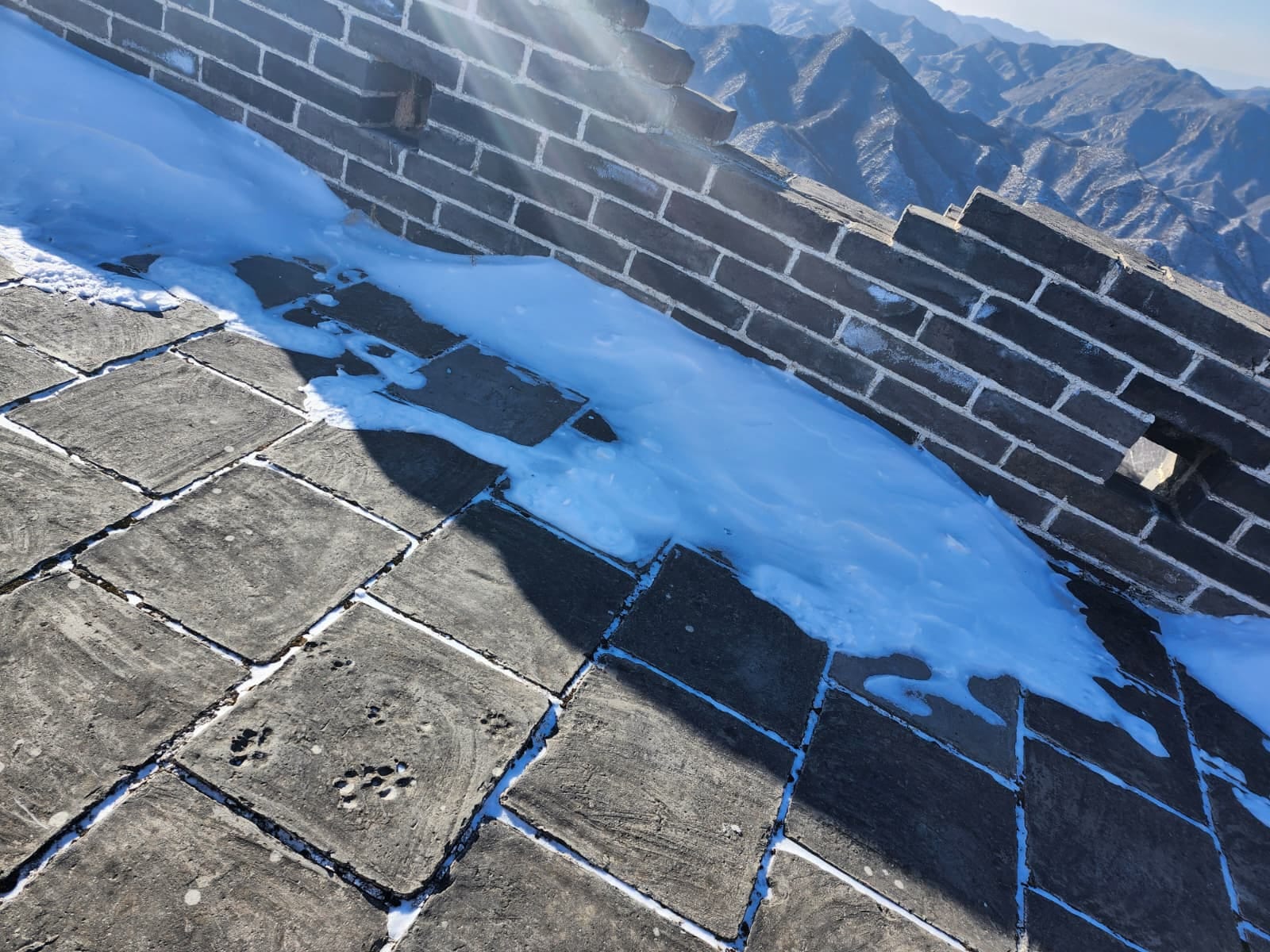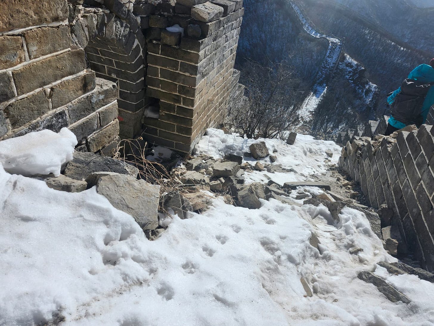 It was bitterly, bitterly cold. Minus eleven degrees centigrade, but it felt more like minus twenty due to the massive windchill — we were, after all, literally on top of a wall built to run along the top of hills, as exposed as you could get. A thin layer of snow and ice, rising to shin-height in shaded stairwells, made our footing treacherous, as did the unrestored patches with shifting rocks and disintegrating slopes. Taken in conjunction with my backpack holding my entire trip inventory as I’d checked out of the hotel that morning, it added up to the most strenuous outdoor adventure I’d done in months! I was loving every moment of it. (Here’s my video!)