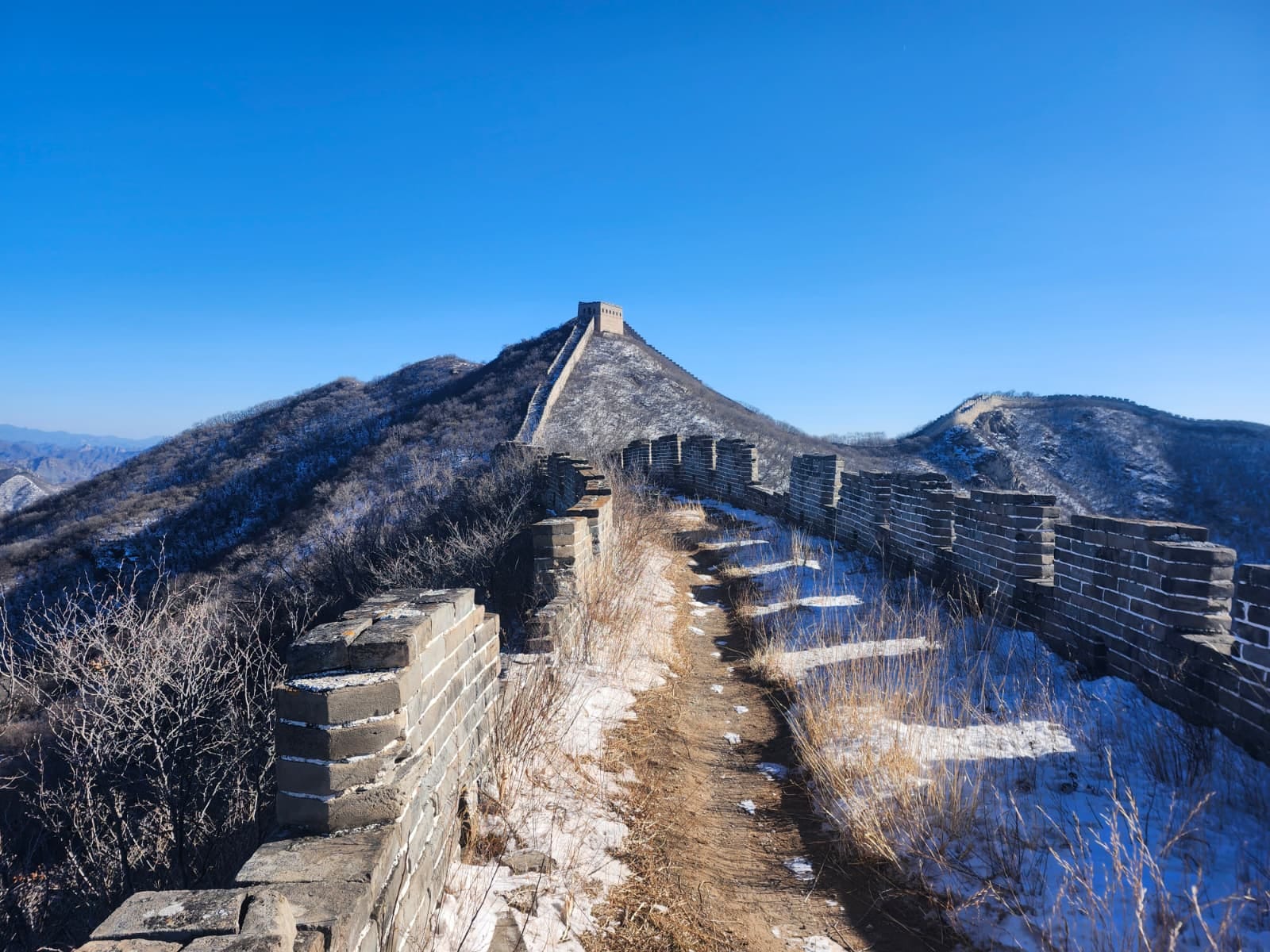 As we continued to walk along the Wall, we learned more and more about it. The guard towers, including the famous “General’s Tower,” were practically wind tunnels, concentrating the freezing gusts to make us feel even colder on than the rest of the wall. Mr. Huang told us that Ming Dynasty soldiers on the Wall were sometimes paid in firewood. The immense manpower requirements involved in making millions of bricks and schlepping them up to the top of the hills and ridgelines from the Bohai Sea to the Gobi Desert can only be imagined today. Along the upgraded Ming-era Wall, simple messages could be transmissed for miles in just minutes, making the whole thing an optical telegraph — a classic “The beacons are lit! Gondor calls for aid!” situation.