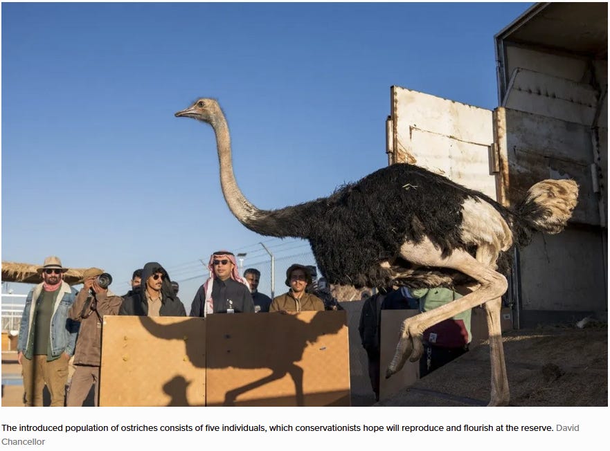 The Arabian ostrich subspecies (Struthio camelus syriacus) was driven to extinction in 1941 by overhunting and habitat loss. In December 2025, five red-necked ostriches (Struthio camelus camelus) were released in the richly biodiverse Prince Mohammed bin Salman Royal Reserve in the northwestern mountains of Saudi Arabia, returning ostriches to Arabia after more than 80 years. Native to North Africa, red-necked ostriches are the largest subspecies of ostrich and thus the largest living bird. They’re endangered, so establishing a new population is very helpful. This is part of a broader program of rewilding, with many other species including oryxes, onagers, and gazelles having been reintroduced to the same reserve in recent years. Awesome work!