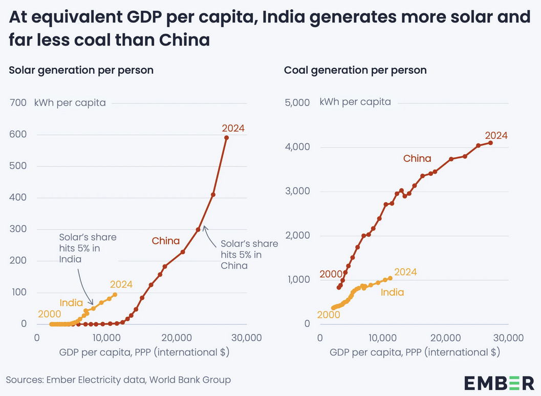 India is posting truly spectacular clean electrification statistics, as summarized in a great new report from world-leading think tank Ember. India today has similar GDP per capita to China in 2012, but has much more solar generation and much less coal generation per person than China did at the same stage of economic development!