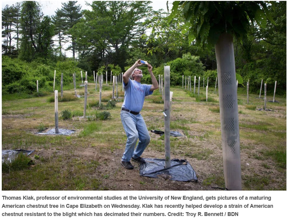 Hi Sam, You are continuing to do an amazing job compiling positive environmental news from around the world. Your regular reports are deeply appreciated and valuable. And thanks for noting the emerging evidence of fungal blight tolerant American chestnut trees that we are cultivating and testing. These trees have an extra gene from wheat to reduce the fungus' toxicity but they are otherwise 100% American chestnut. We continue to push forward on the effort to restore the Foundational American chestnut to the eastern US. - Tom Klak