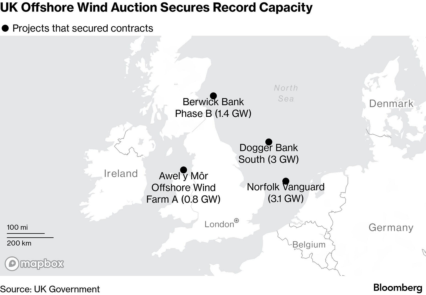 The United Kingdom’s latest offshore wind project auction procured a record-high 8.2 gigawatts (8,200 MW) of new capacity, to be built in four new projects.