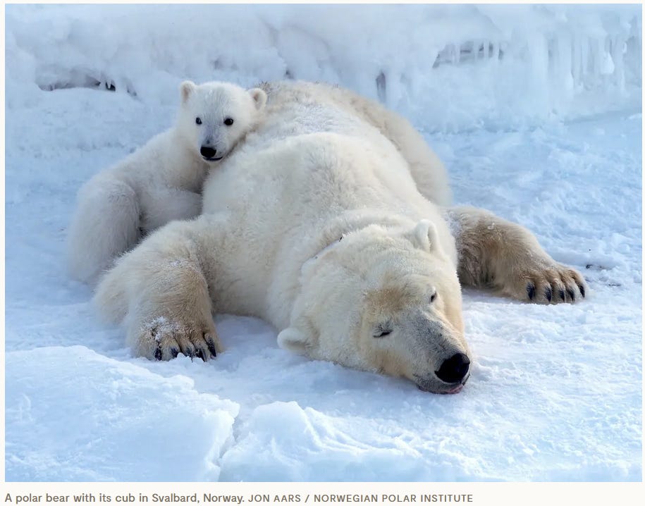 Svalbard, a Norwegian-administered archipelago in the high Arctic, has seen rising temperatures and major ice loss in recent years. A new study analyzed variation in polar bear body size as recorded during captures and weighing of 770 bears across Svalbard from 1995 through 2019. To their surprise, they found that the local polar bears have become fatter in recent years, indicating good health despite rapid environmental change. The broader Barents Sea polar bear population even appears to be increasing! Svalbard’s polar bears seem to have made an unexpectedly fast transition from hunting seals on sea ice to hunting land-based prey such as reindeer, walruses, and seabird eggs. A fascinating new example of climate adaptation!