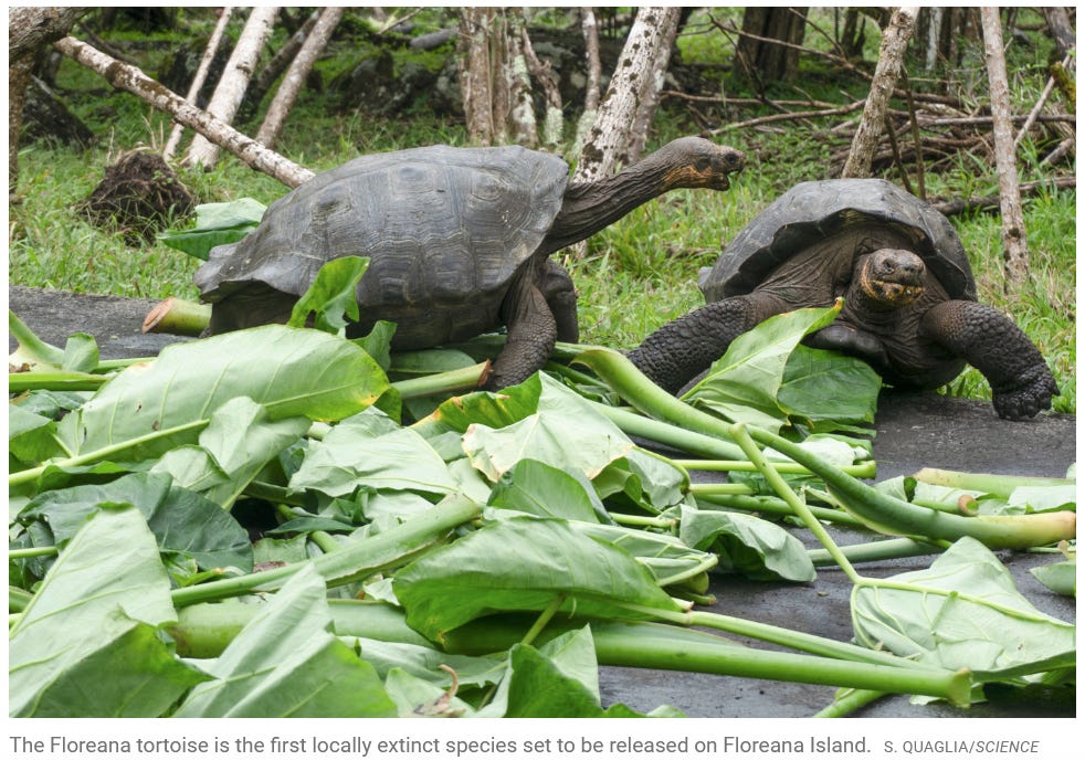 In 2024, scientists moved 19 Floreana giant tortoises (Chelonoidis niger niger) to an outdoor pen on Floreana Island, one of Ecuador’s famous Galápagos Islands. This seed-dispersing ecosystem-engineer giant tortoise subspecies was wiped out on its eponymous home island and thought extinct, but has been restored in recent years by a captive-breeding program backcrossing hybrids found on a different island. Since that reintroduction (and concurrent efforts to control invasive rats, cats, and bloodsucking flies), scientists have noticed an ecosystem-wide resurgence, with increasing populations of lava lizards, Galápagos rail birds, and local invertebrates. They plan to soon release the Floreana tortoises into free-range wild living and build towards reintroducing 12 more vanished native species that survived on other islands, including the Galápagos hawk, lava gull, Floreana mockingbird, brujo flycatcher, and several different species of “Darwin’s” finches. Excellent rewilding work! Great news.