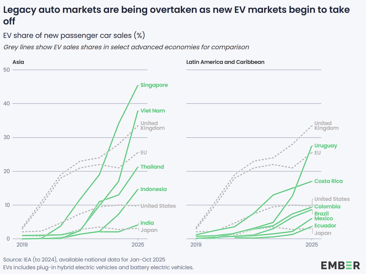 Leading think tank Ember reports that electric vehicle sales rapidly accelerated worldwide in 2025, with many emerging markets rapidly “leapfrogging” the U.S. and Europe. To take just a few of many examples, in January-October 2025 EVs made up over 45% of new passenger car sales in Singapore, over 37% in Vietnam, over 21% in Thailand, over 14% in Indonesia, and over 8% in Brazil, all sharp increases over 2024. (Note: EVs’ efficiency reduces emissions even when charged on fossil-heavy grids). For comparison, EVs are at ~10% of sales in the U.S. and over 50% in China. Awesome!