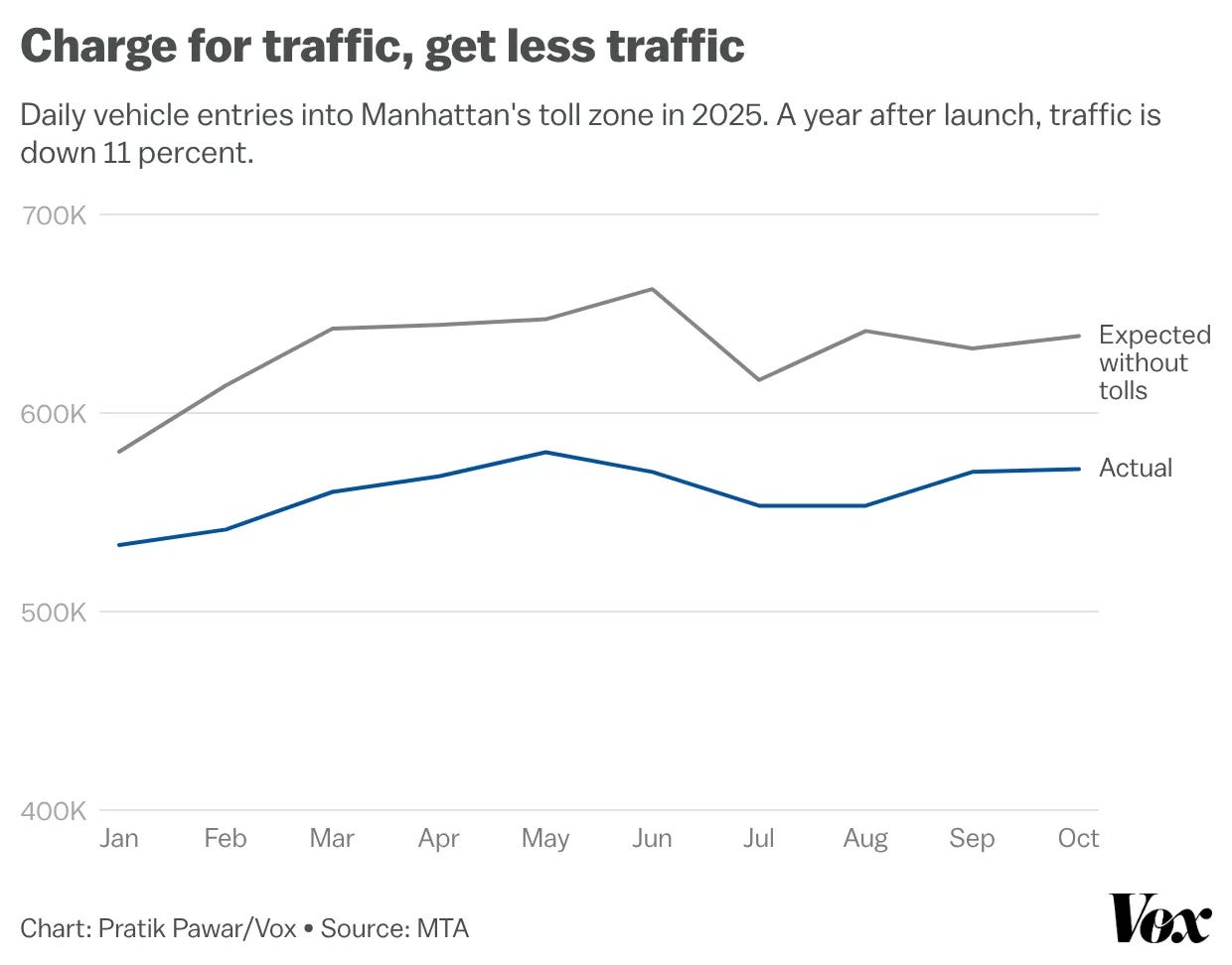 The $9 congestion pricing fee for cars to enter central Manhattan, adopted by New York City a year ago, has been a massive success! Traffic entering the toll zone has decreased by 11%, average vehicle speeds increased by 23%, and morning rush hour speeds at the Holland Tunnel increased by 51%. Millions of faster commutes! Subway and bus ridership and revenue have increased as well. An improvement in air quality will likely become statistically incontrovertible within a few years. Spectacular work!